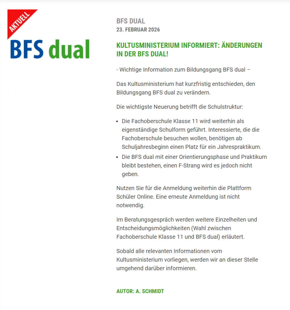 Das Niedersächsisches Kultusministerium informiert über wichtige Änderungen im Bildungsgang BFS dual ab dem Schuljahr 2026/27.