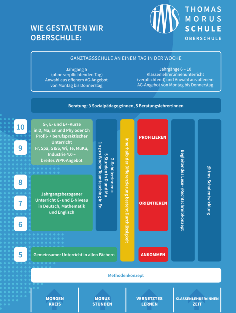 Es geht darum, die Schüler*innen auf das unabdingbare selbstständige Handeln in ihrer privaten und beruflichen Zukunft vorzubereiten. MORUS ist ein Pilotprojekt im Rahmen der TMS-Schulentwicklung @tms, das zunächst in den Jahrgängen 5-7 etabliert werden soll. Hierbei ist MORUS mit 10 Stunden in der Woche bei zwei Stunden am Tag (alle Klassen eines Jahrgangs haben zur gleichen Zeit MORUS) ein fester Bestandteil der Stundentafel und deckt verschiedene Fächerkombinationen ab.